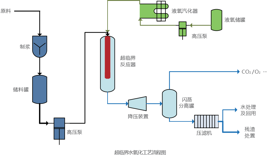 河北省廊坊市廊坊經(jīng)濟技術(shù)開發(fā)區(qū)危險廢物經(jīng)預(yù)處理制備成具有流動性的漿態(tài)物質(zhì),利用高壓原料泵將其壓力升高到22.1MPa以上,原料與氧氣同時進入反應(yīng)器內(nèi)進行超臨界水氧化反應(yīng),危廢中的污染物被分解,產(chǎn)物經(jīng)初步降溫后進入降壓工序,在降壓的過程中,通過閃蒸分離使物料溫度降低到100℃以下,產(chǎn)物中的CO2 、O2等氣體產(chǎn)物分離出來,固液產(chǎn)物經(jīng)壓濾處理后實現(xiàn)分離,水經(jīng)進一步處理后可回用,殘渣通過處置完成最終處理。