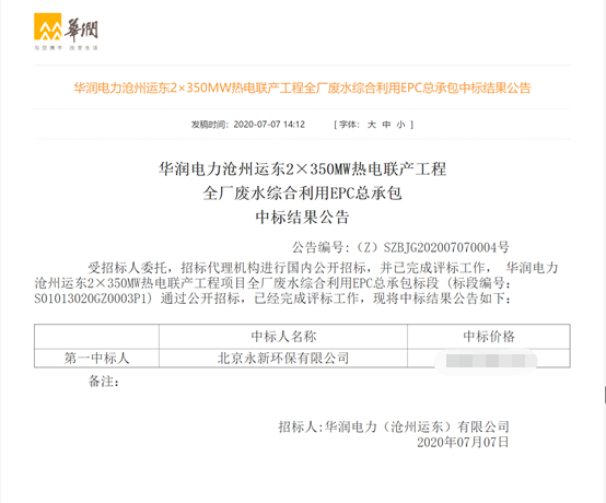 河北省廊坊市廊坊經(jīng)濟技術(shù)開發(fā)區(qū)2020年6月,北京永新環(huán)保有限公司經(jīng)過9家角逐,成功中標華潤電力滄州運東2×350MW熱電聯(lián)產(chǎn)工程全廠廢水綜合利用EPC總承包項目.